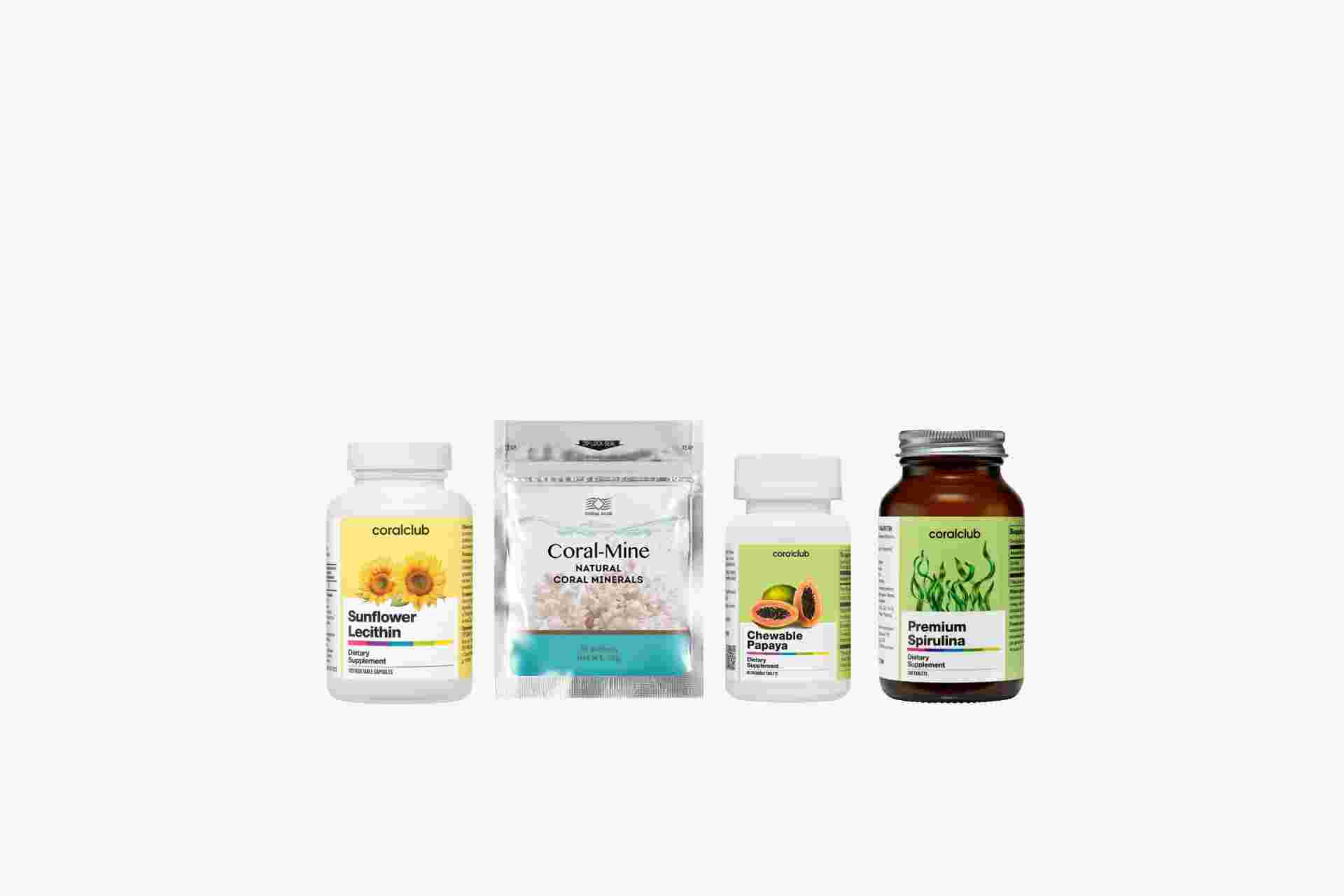 - Корал-Майн, 3 упаковки (30 саше), - Лецитин подсолнечный, 1 упаковка (120 растительных капсул), - Жевательная папайя, 1 упаковка (90 жевательных таблеток), - Премиум Спирулина, 1 упаковка (200 таблеток)
